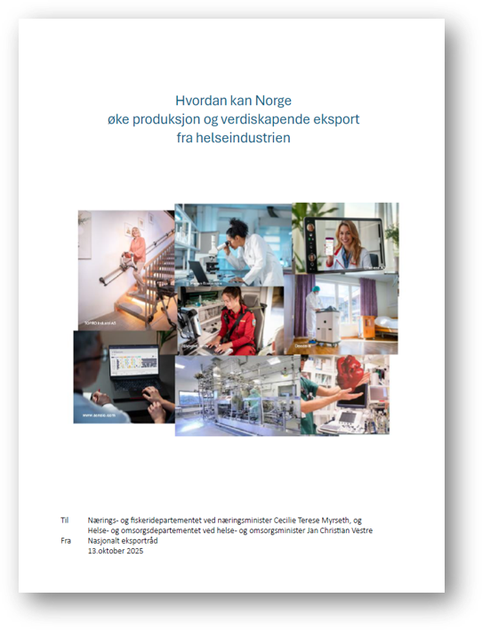 Nasjonalt eksportråd leverte i oktober 2025 en rapport med anbefalinger til hvordan Norge kan øke produksjon og verdiskapende eksport fra helseindustrien.